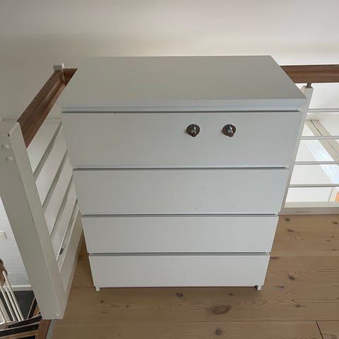 Malm kommode med 4 skuffer. Købt for 7 mdr siden og står flot udover et enkelt lille hak på den ene skuffe. Det er vist på sidste billede