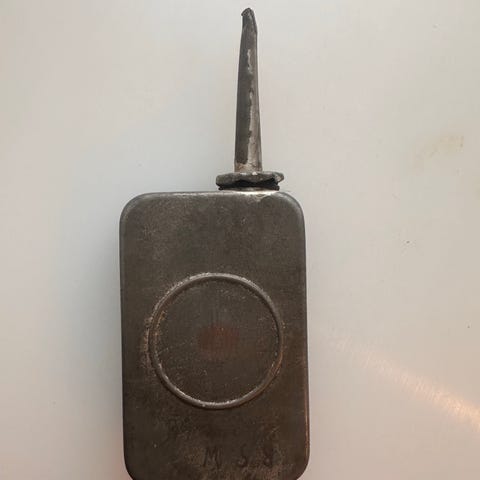 Ukendt mærke olie kande i metal. Kanden med kegleformet krop, bund i messing og smal tud i messing, sandsynligvis med patina fra brug og alder. Egnet som funktionel tragt eller som dekorativ genstand i f.eks. værksted, køkken eller som vintage interiørdetalje og kan sendes
