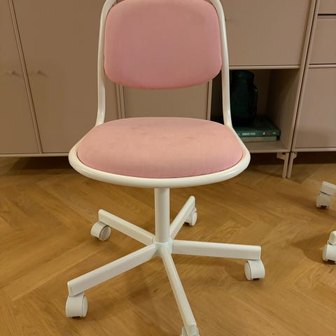 En fin lyserød børne-kontorstol. Der er få pletter på den, se billederne. Men ellers er den i fin stand.