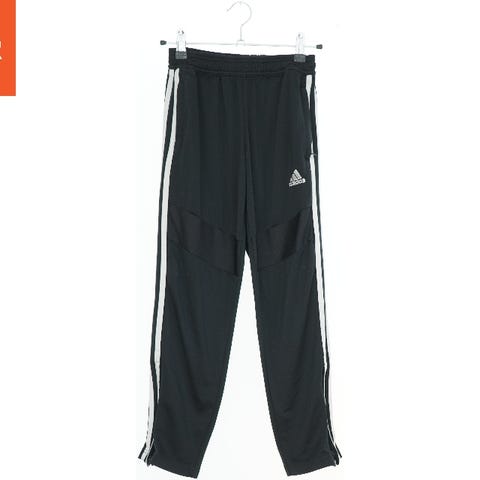 Et par sorte træningsbukser med hvide striber langs siderne. Bukserne har elastik i taljen og ved anklerne. Der er en lille Adidas logo på forsiden af bukserne.