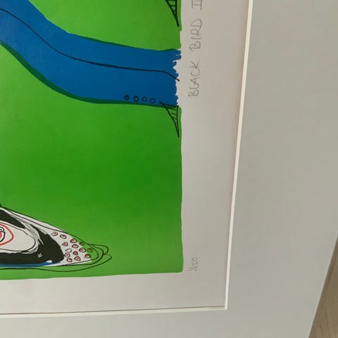 Litografi med abstrakt motiv i klare farver som grøn, blå, rød, sort og pink. Billedet viser en komposition af organiske og geometriske former med håndtegnede linjer. Trykket er monteret i en enkel, lys passepartout og ramme, som indrammer motivet. Velegnet som vægdekoration i stue, kontor eller andre opholdsrum, hvor man ønsker et farverigt, moderne udtryk.