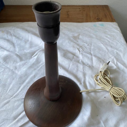 Anden bordlampe, Skøn lampe i teaktræ og messing/kobber med masser af charme - udformet som en gammel vandpumpe. Virker perfekt. Pærer medfølger ikke.