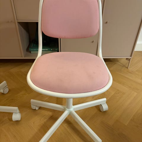 Lyserød børne-kontorstol. Der er får pletter på, se billederne, men ellers er den i fin stand.