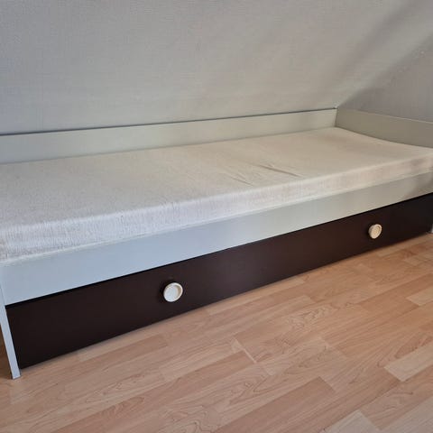 Fin skibsbriks med to skuffer, skummadras og ryghynder. Betrækket er i god stand.