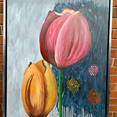 Røde tulipaner i gul vase på bord med banan og en æske tændstikker.