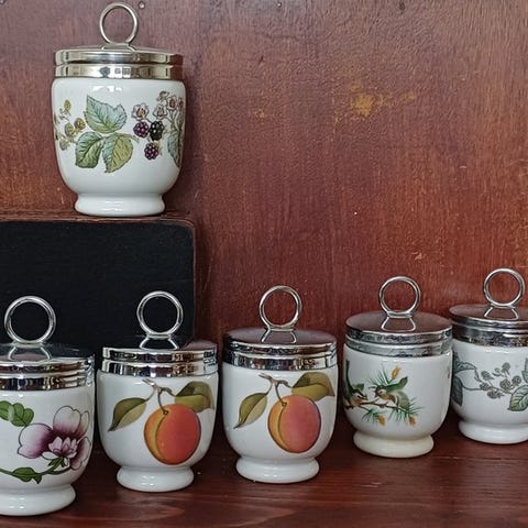 Porcelæn, Æggebægre, Royal Worcester, Smukke engelske egg coddlers fra Royal Worcester 2 stk., dekoreret med frugtmotiv begge med fersken og brombær. Har aldrig været i brug men blot stået til pynt.