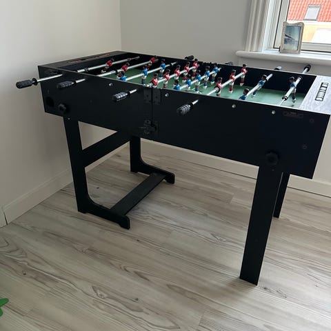 Sammenklappeligt bordfodboldbord i sort med grøn spilleflade. Der er manuelle måltællere over hvert mål og boldindkast i siderne. Bordet kan stilles lodret for pladsbesparelse, når det ikke er i brug. Velegnet til indendørs brug i hjemmet, f.eks. i stue, kælder eller spillerum. Mangler bolde