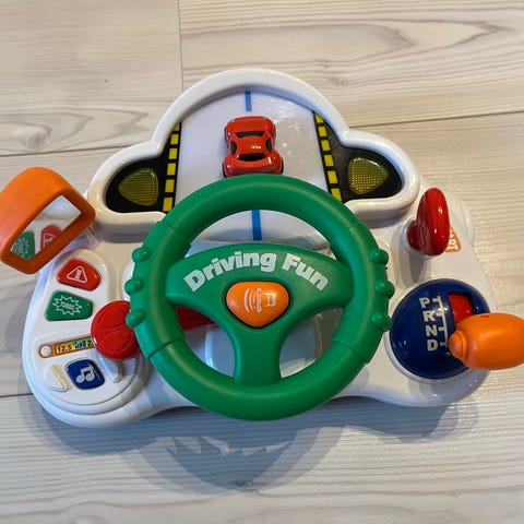 Sjovt og solidt rat i træ fra Mamamemo. 56 cm højt og passer bedst til børn fra 3 år. Har fine detaljer som kliklyd ved drejning, gearstang og pedaler - perfekt til rolleleg.