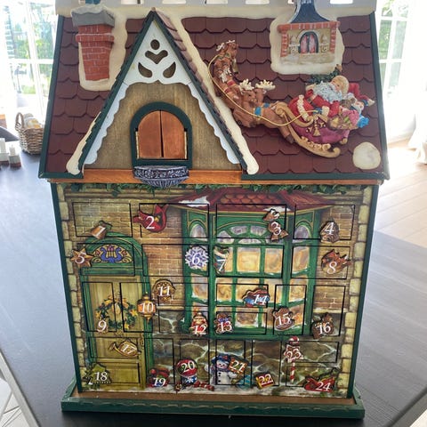 Julekalenderhus i træ, malet og med skuffer. Pæn stand, dog med et par mærker - se billeder. 44 x 22 x 28 cm.