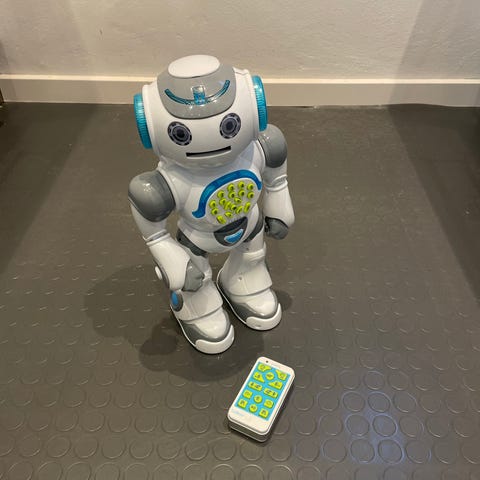 robotlegetøj i hvid plast med sorte og blå detaljer. Robotten leveres med fjernbetjening og flere farvede skiver/tilbehørsdele som kan skydes afsted. Legetøjet er beregnet til børn og kan bruges til leg med robotbevægelser og simple funktioner, der styres via fjernbetjeningen. Egnet som indendørs legetøj på gulv eller anden plan overflade.