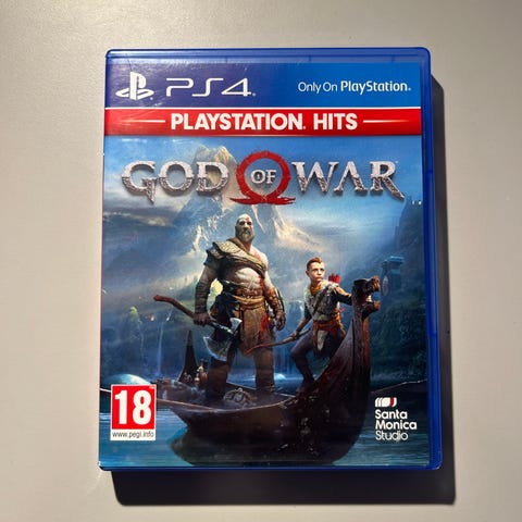 Sony God of War Playstation 4 spil. Fysisk udgave i blå PS4-plastæske med spil-disk. Udgaven er markeret som Playstation Hits og er klassificeret til aldersgrænsen 18 år. Spillet er til Playstation 4-konsoller og leveres på Blu-ray disk i original æske.