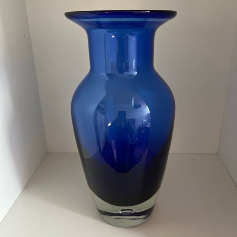 Fineste vintage Holmegaard vase i blå, let buttet form med prikmønster