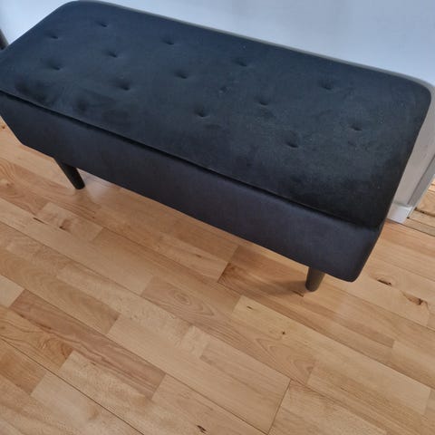 Bænk med opbevaring i hvidmalet træ. Bænken har ryglæn og armlæn med sprosser samt en polstret siddepude i lys, neutral farve. Sædet kan løftes op og giver adgang til et opbevaringsrum under sædet, som kan bruges til legetøj, puder eller andre ting. Velegnet til brug i børneværelse, entre eller stue som siddeplads kombineret med opbevaring.