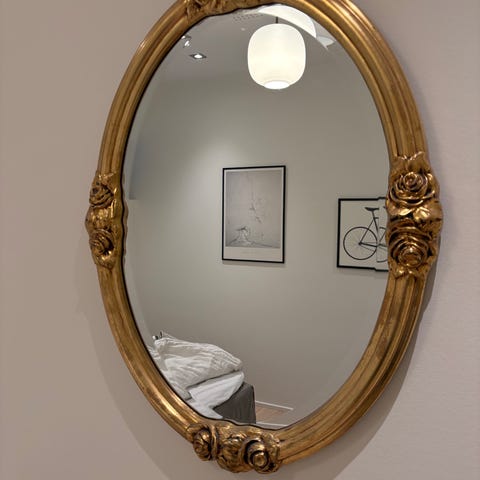Smukt antikt spejl i guld, med rigtig fine detaljer langs kanten.