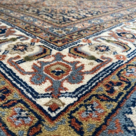 Stort og virkelig smukt ægte tæppe. Tæppet har brugsspor men ikke noget markant, lidt farveændring i den ene ende grundet sollys. Sælges udelukkende grundet flytning.