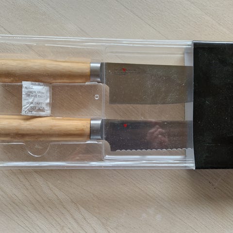 En brødkniv og en kokkekniv. Begge måler i fuld længde 32 cm.