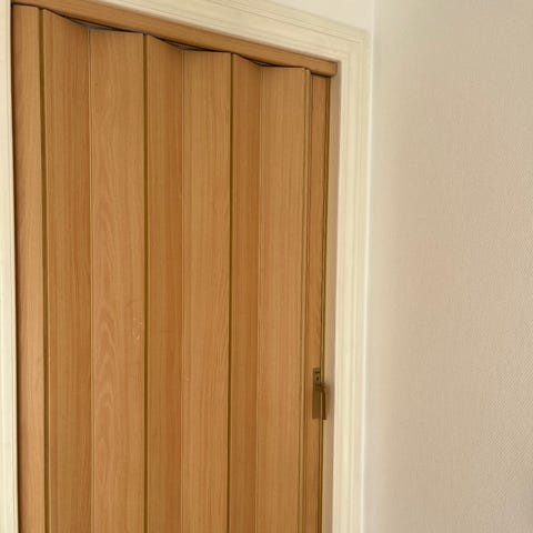 Pella foldedør i træ. Døren er udført i lakeret træ med lodrette profiler og indbyggede beslag i metal. Egnet som rumadskillelse eller skydeløsning i bolig eller kontor, hvor der ønskes en pladsbesparende døråbning. Monteringsbeslag og skinner fremgår af billederne.