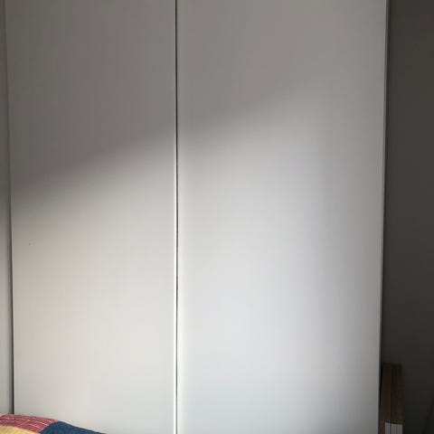 Hvidt garderobeskab med skydelåger og spejl på den midterste låge. Skabet har flere sektioner med bøjlestang til ophæng af tøj samt hylder og trådkurve til opbevaring af fx tøj og tekstiler. Øverst er der ekstra overskabe til yderligere opbevaringsplads. Velegnet til soveværelse, entré eller garderoberum. Lågerne er massive. Useriøse henvendelser besvares ikke. Afhentes på adresse.