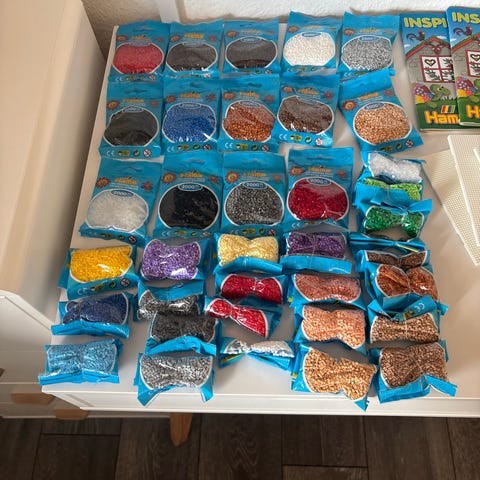 Hama perlesæt med forskellige farvede rørperler i plast og flere gennemsigtige perleplader i forskellige former. Sættet leveres i en opbevaringsbøtte med låg. Egnet til kreative perleprojekter, hvor motiver kan lægges på pladerne og efterfølgende stryges efter behov. Velegnet til børn under opsyn af en voksen på grund af små dele.