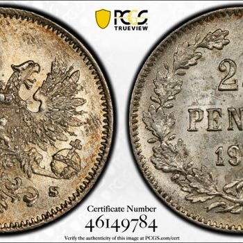 Skandinavien Mønter FINLAND SØLV 25 Pennia 1917 No Crowns! KM#19 Nicholas II