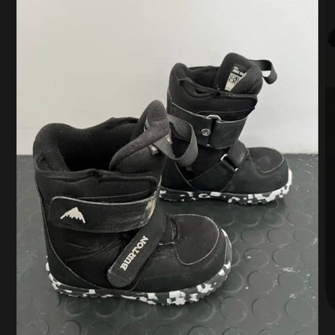 Burton Grom snowboardstøvler til børn i størrelse EU 34 (US 3, UK 2,5, JPN 21). Støvlerne er sorte med flerfarvet mønster i siderne og blå detaljer. Lukkes med velcroremme for nem justering og af- og påtagning. Egnet som snowboardstøvler til børn på begynderniveau og let øvede.