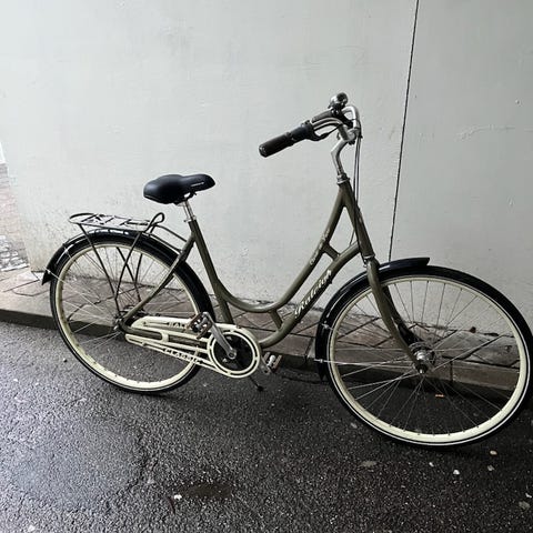 Taarnby damecykel. Cyklen er rød med lav indstigning og er designet til kvinder. Udstyret med forkurv i metal, bagagebærer og sadel med moderat polstring. Velegnet som hverdagscykel til bykørsel og transport af mindre ting i kurven og på bagagebæreren.