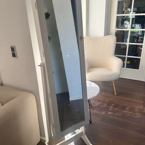 Lille fint skab til væggen med plads til smykker og makeup. Spejl og små lys (batteri) i kanten. Rigtig fin stand.