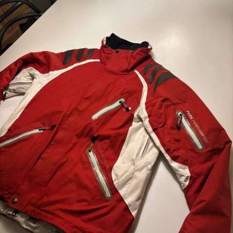 Jakken er sort og har været brugt et par sæsoner på ski. Den har lidt brugsspor - kan ses ved ærmer og armhuler (se evt billede).