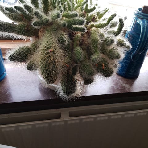 Stor grøn cowboykaktus egnet som stueplante eller indendørs dekoration. Planten er høj og slank med flere oprette grene og står i en potte. Velegnet til placering ved vindue eller i lyse rum, hvor der ønskes en robust og dekorativ plante med et markant udtryk.