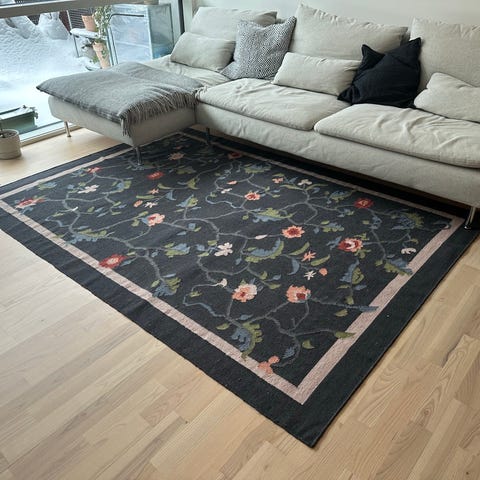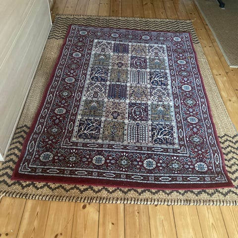 IKEA Valby Ruta tæppe med orientalsk inspireret mønster. Rektangulært tæppe i rød og flerfarvet design med dekorativ bort hele vejen rundt. Egnet som gulvtæppe i stue, soveværelse eller andre opholdsrum. Fremstillet som fladvævet tæppe, der ligger stabilt på gulvet og kan bruges under fx sofabord eller spisebord.