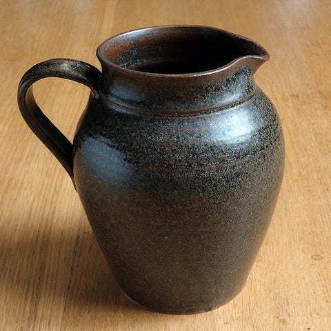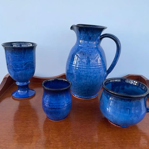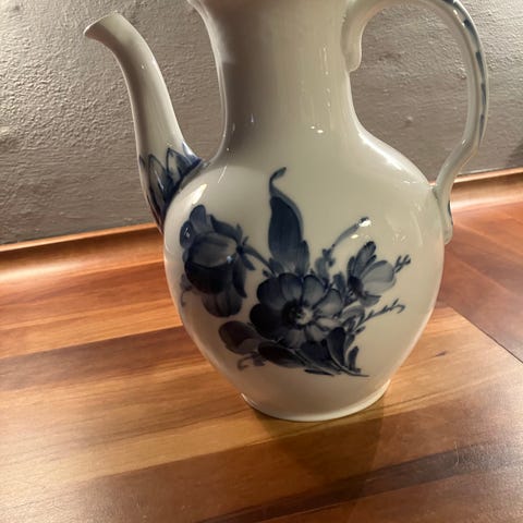 Keramik kande og skål i sæt. Begge dele er i hvid keramik med blå, håndmalet blomstermønster. Kanden har hank og hældetud og kan bruges til fx vand, mælk eller saft. Skålen er rund og egner sig til servering af fx salat, frugt eller tilbehør. Sættet kan anvendes både til daglig brug og som dekoration i køkken eller på bordet. Håndmalet af Dimitris Keramos eller hans svoger.