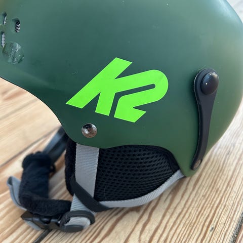 K2 skihjelm i grå farve. Hjelmen har justerbart spændesystem i nakken og ventilationsåbninger i skallen. Indersiden er polstret for øget komfort, og der er integrerede ørebeskyttere. Velegnet til brug på ski eller snowboard.