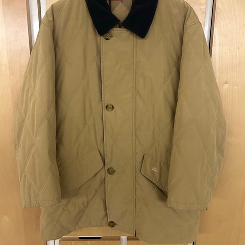 Burberry frakke til kvinder i str. L. Frakken er i beige bomuld med klassisk ternet for. Modellen har dobbeltradet lukning, bælte i taljen og stropper ved ærmerne. Velegnet som yderjakke i overgangs- og køligere vejr.