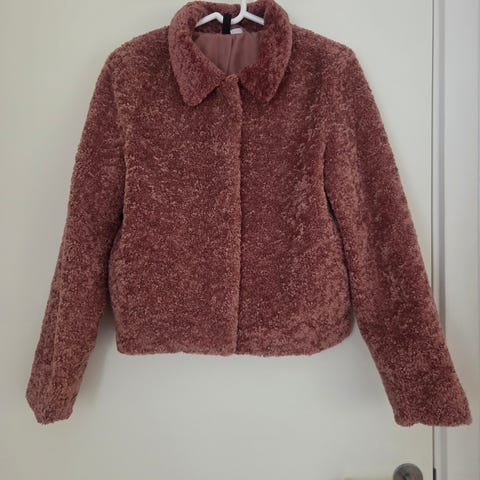 H&M jakke til kvinder i str. S. Jakken er sort og fremstillet i polyester med teddy-/pelslignende overflade. Den har gennemgående lynlås foran, krave og sidelommer. Indersiden er glatforet, og der er justerbar snøre forneden til at tilpasse pasformen. Velegnet som overgangsjakke eller yderlag på køligere dage.