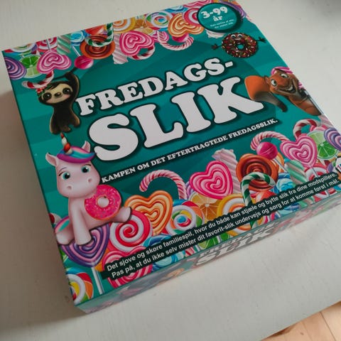 Fredagsslik brætspil for børn og familier. Spillet er egnet til alderen 3-99 år og kan spilles af flere deltagere. Temaet er slik og søde figurer, og spillet foregår på en farverig spilleplade med felter og illustrationer. Indeholder blandt andet spilleplade og figurer, som bruges til at rykke rundt i spillet. Velegnet som familiespil og til hyggestunder med børn.