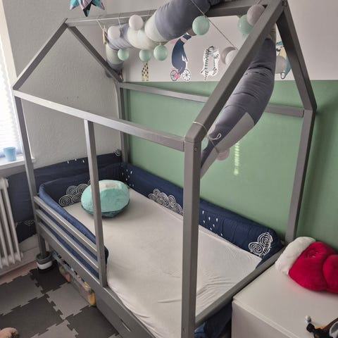 Den lille trappe kan monteres på begge sider af sengen. Betrækket til madrassen er nyvasket - det kan med lynlås tages af og på.