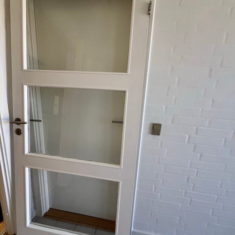 Indvendig hvidmalet glasdør med 12 glasfelter og sprosser. Låsesystem og håndtag skal skiftes. Mål: 82,5 x 204 cm, bredde 4 cm. Sælges uden karm