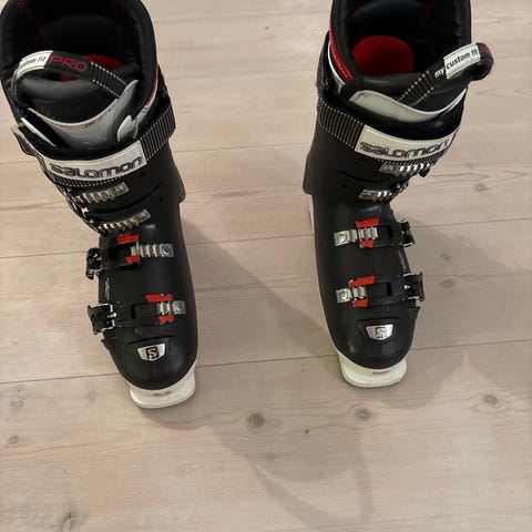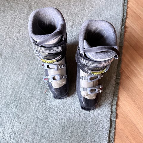 Salomon skistøvler i størrelse 25 i sort farve. Modellen har flere justerbare spænder på fronten og en rem bagtil for bedre pasform og støtte. Ydersålen er markeret med størrelse 25 og har mønster for bedre greb ved gang. Egnet til alpint skiløb med almindelige skibindinger.