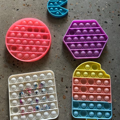En masse pop it’s i forskellige størrelser. Inkl et spil uden terninger og et penalhus.