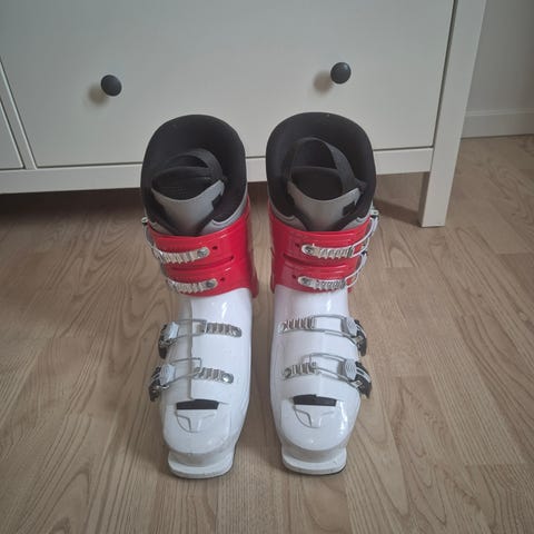 X-D Kids skistøvler i sort, hvid og rød. Justerbar størrelse, jeg vurderer det er til str 35-38. Modellen har fire justerbare spænder i metal og plast for god tilpasning om foden. Støvlerne har justerbar inderstøvle (liner adjustable), som kan tilpasses barnets fod for bedre komfort. Ydersålen er udformet til brug i alpine skibindinger.