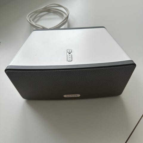 Tre Sonos produkter: En hvis Play:1, en hvid Play:3 og en hvid Bridge. Sælges da de ikke har været i brug i nogle år, men virkede upåklageligt da de sidst var tilsluttet.