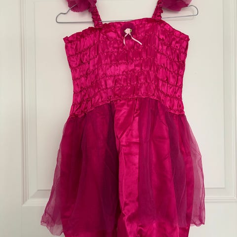 H&M kjole til pige i str. 80. Ærmeløs model i lyserød polyester med blank overflade og lagdelt skørt. Kjolen har dekorative stofblomster foran i taljen og lukkes med lynlås i ryggen. Velegnet som fest- eller selskabskjole til små piger. Eller som prinsesse udklædning til fastelavn.