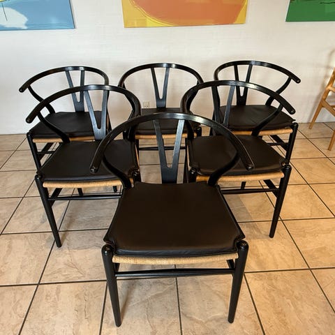 Y-stolene er cirka fem år gamle, men er ganske velholdte og fejler intet. Heller ikke i fletværket, som stadig er stramt og intakt. Ingen pletter, skrammer, ridser og den slags. Til gengæld har træet den helt rette glød og patina, som gør de klassiske danske designmøbler så meget smukkere.