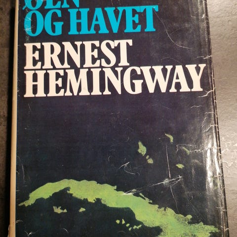 Ernest Hemingway Øen og havet bog i hardback-udgave. Bogen er på dansk og indbundet med grønt mønstret omslag og sort ryg med grøn rygetiket. Indersiderne indeholder blandt andet kort over Cuba. Skønlitterær roman i klassisk indbinding, egnet til læsning eller som del af en samling af Hemingway-udgivelser.