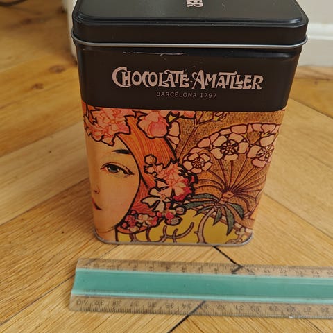 Ca. 20 år gammel metaldåse med låg i fin og ren stand.