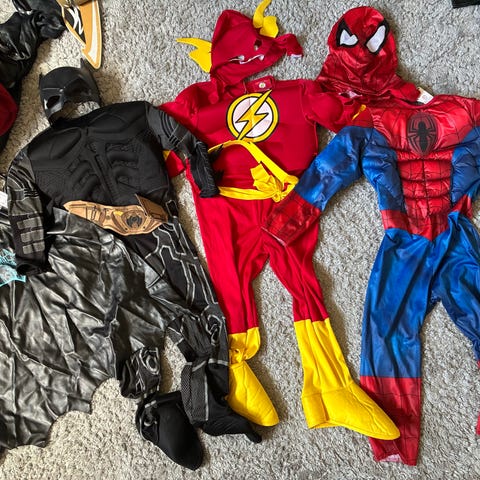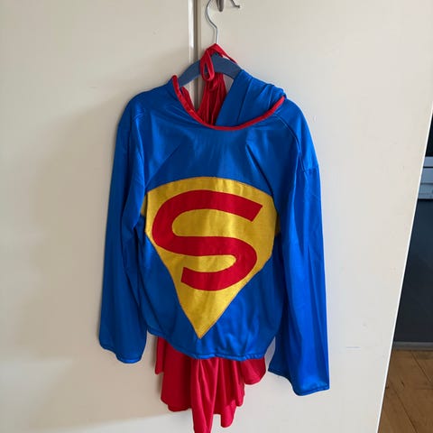 Superman heldragt i str. 3-4 år. Dragten er blå med Superman-print og aftageligt rødt kappe-look på ryggen. Materialet er polyester. Egnet til udklædning eller fastelavn.