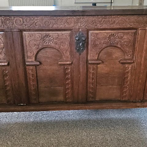 Trækiste og spejl i matchende stil. Kisten er udført i træ med kraftige messingbeslag og hængsler samt indvendig bakke/indsats til opbevaring. Spejlet har træramme med udskåret, dekoreret felt øverst. Sættet kan anvendes til opbevaring og som møbel i fx entre, soveværelse eller stue.