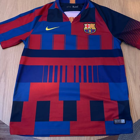 Nike FC Barcelona fodboldtrøje til mænd i størrelse S. Trøjen er gul med røde og blå detaljer samt klublogo på fronten.