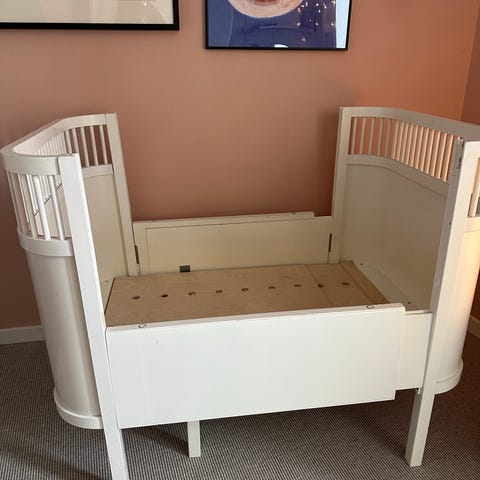 Original Lille Per-seng der kan trækkes ud til juniorseng - madras medfølger. Den er brugt til to børn og har enkelte brugsspor, som ses på billedet, men den fungerer helt optimalt, og vi har haft stor glæde af den.