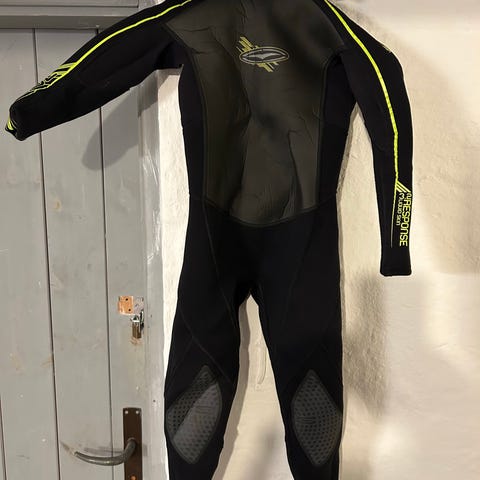 Gul våddragt til børn/junior i størrelse 152 (JXL). Dragten er helkropsmodel med lange ærmer og ben. Farven er overvejende blå med sorte felter. Materialet er neopren (polykloropren) med indhold af nylon, som giver isolering og bevægelsesfrihed i vandet. Egnet til svømning og andre vandaktiviteter. Lynlås på ryggen for nem af- og påklædning. Brystmål ca. 79 cm og højde ca. 152 cm ifølge mærke.